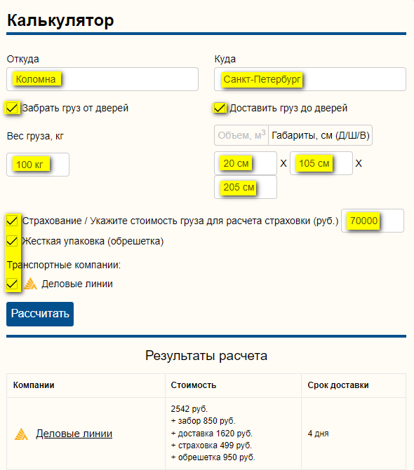 пример расчета до г. Санкт-Петербург (дверь-дверь):