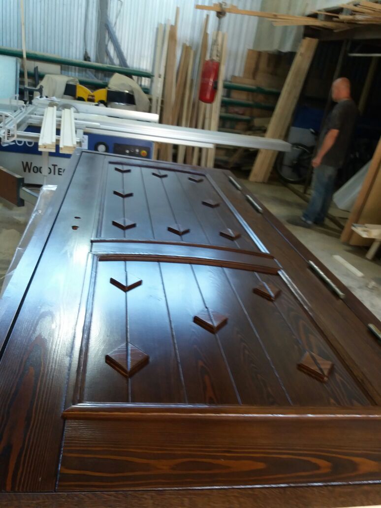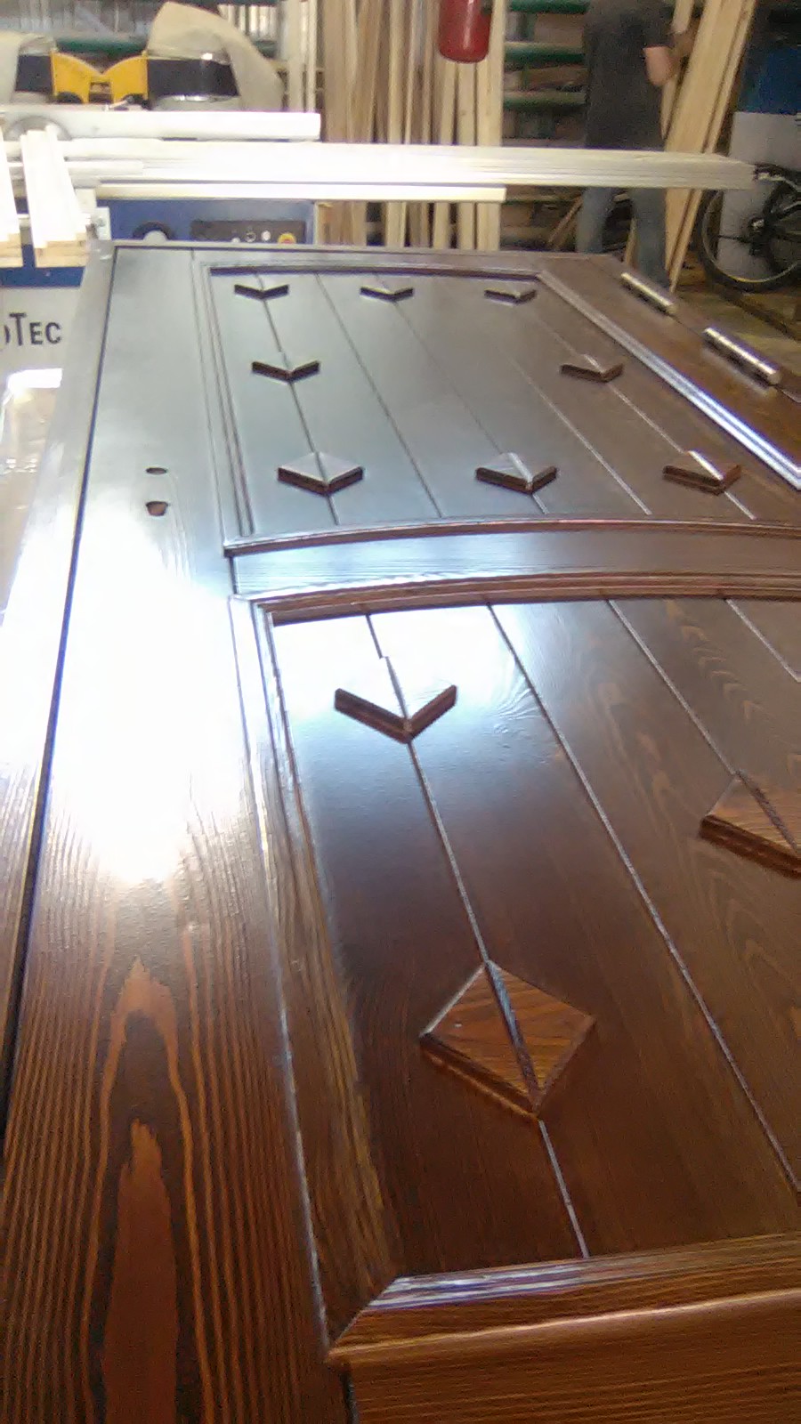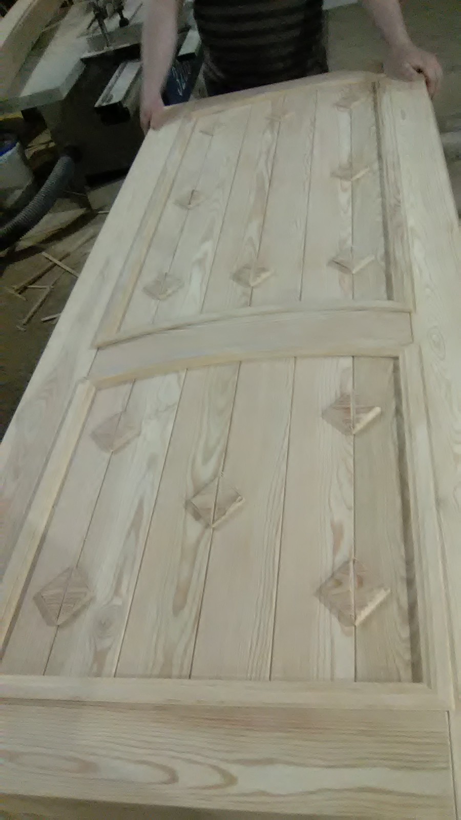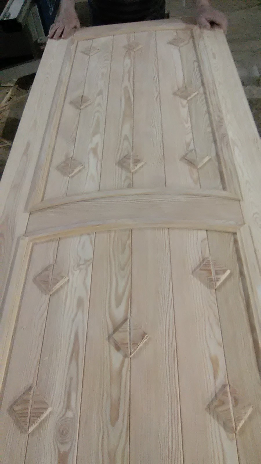 Возможно изготовление двухстворчатых и арочных входных деревянных дверей такого типа.